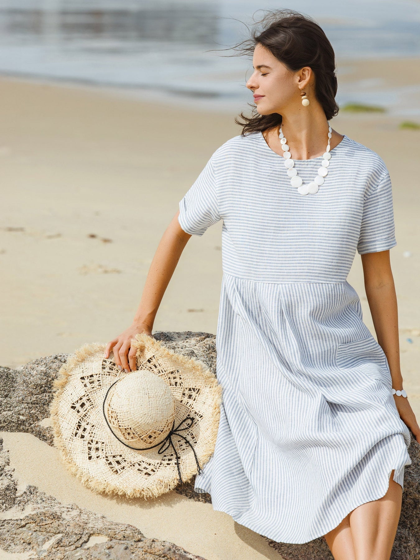 100% Linen Pinstripe Paneled Short-Sleeved Dress MORGAN