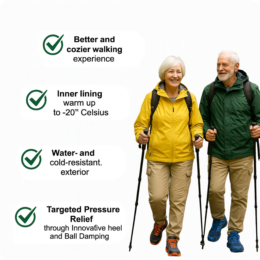 An older couple dressed in outdoor hiking gear, walking with trekking poles and smiling. The image includes four highlighted product features in English, each with a green checkmark: - More comfortable walking experience - Warm inner lining up to -20°C - Water and cold-resistant outer surface - Targeted pressure relief through innovative heel and forefoot cushioning system. The background is natural and outdoorsy.