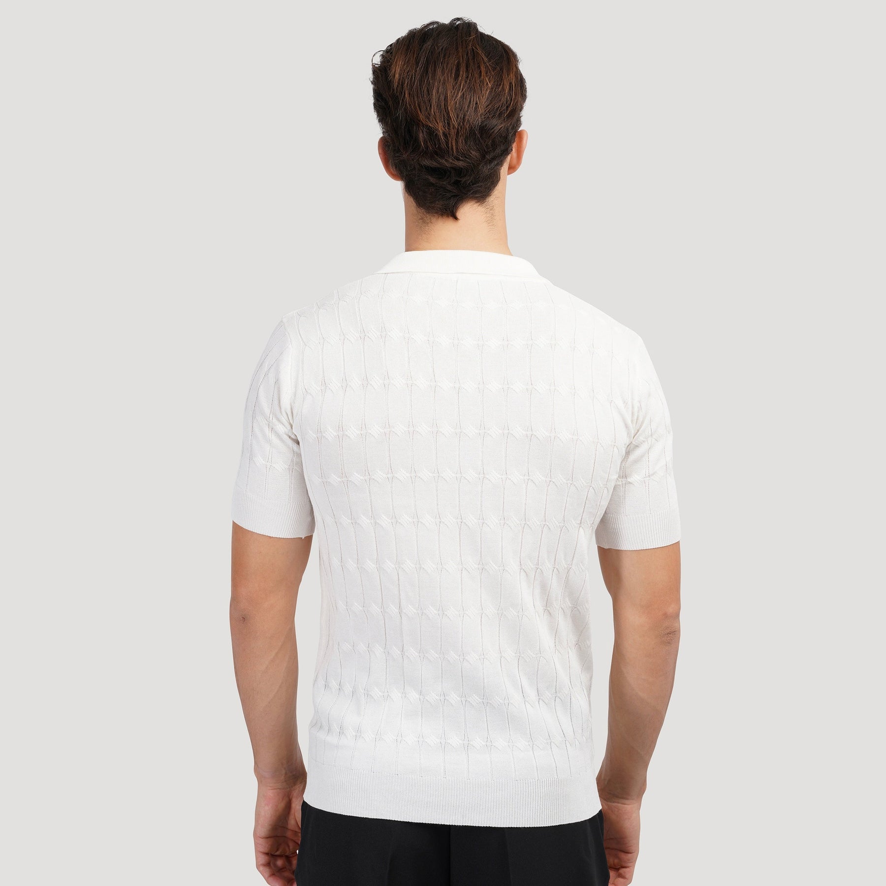 Short sleeve polo shirt made of a soft textured knit fabric. Lapel collar with front opening. Ribbed cuffs and hem. Slim fit silhouette with a structured pattern, ideal for smart-casual looks.