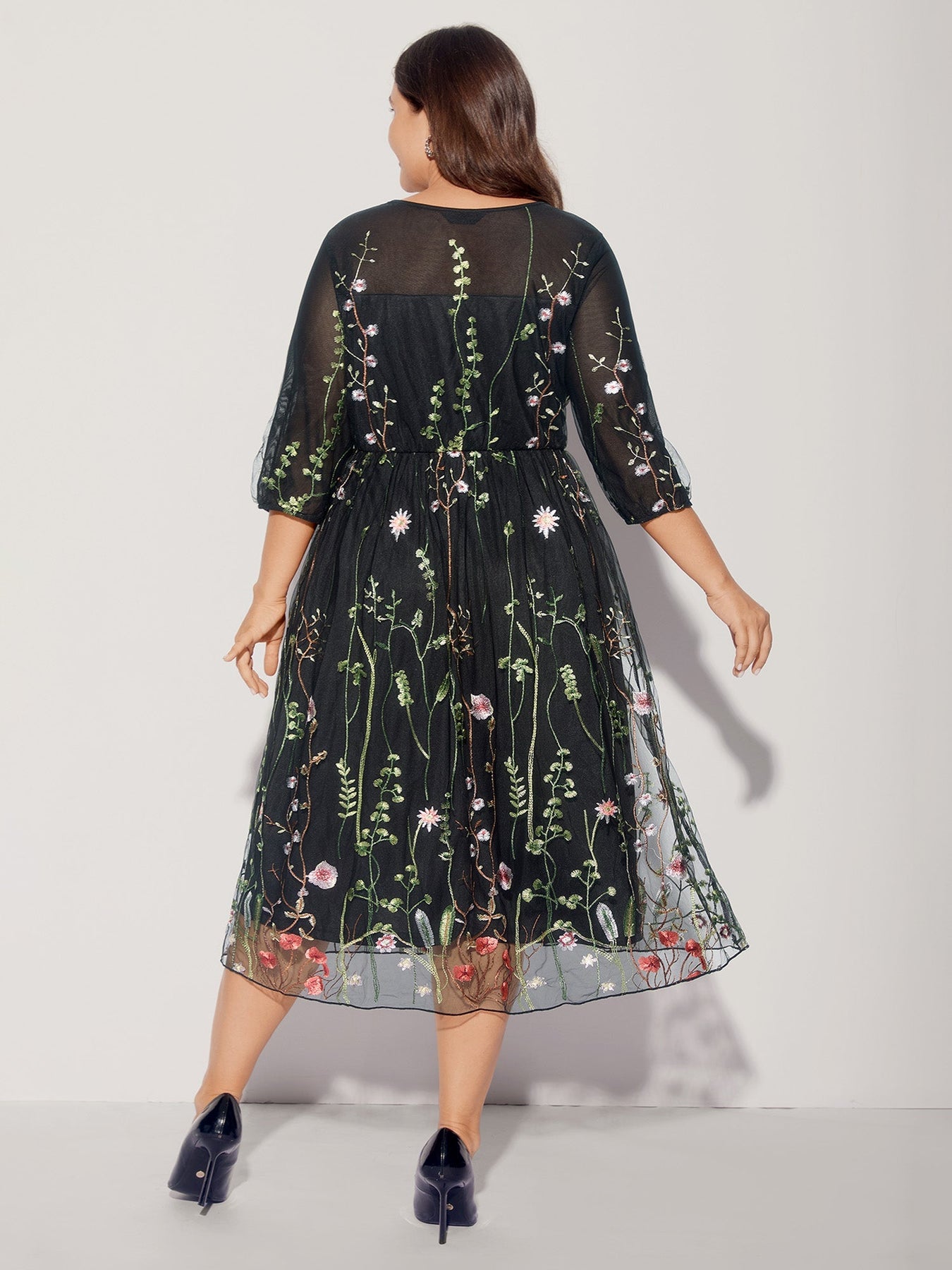 Floral Embroidered Elastic Waist Lined Midi Dress